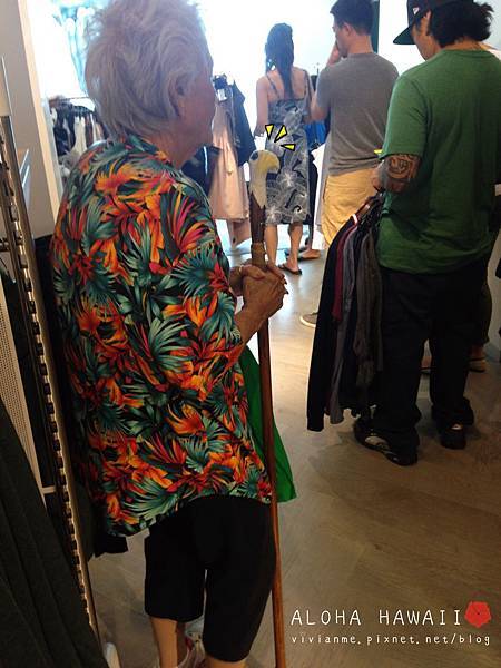 一旁的婆婆非常帥氣,衣著熱帶風情襯衫手拄著拐杖