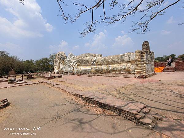 此為大城最大的戶外臥佛,聽著阿Ming講解:這裡曾經淹過大水將臥佛一半都蓋掉,大水退去後留下斑駁的佛身