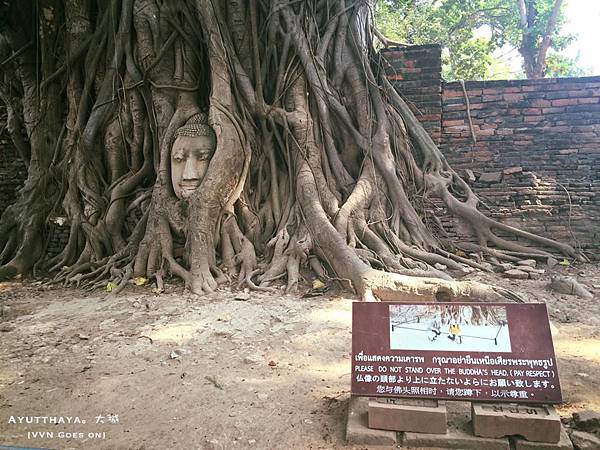 當地居民對佛頭是非常尊敬的,拍照時絕對不能比他高一旁還有告示牌提醒
