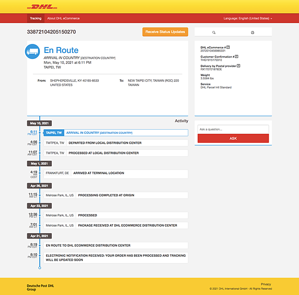 | 此次訂購4/21下單,4/23出貨 包裹流浪從美國到德國開始流浪 5/1狀態新後停滯好幾天, 終於在5/11更新抵達! 嚴格算起來將近20天耶 :( ~~~~ |
