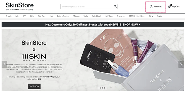 STEP 1:進入至 SkinStore 官網,點選頁面右上角 人像圖示註冊