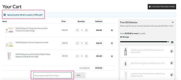 將商品加入購物車後,左上角會有upsale的機制,意圖想讓你買更多獲得免費贈品XDD